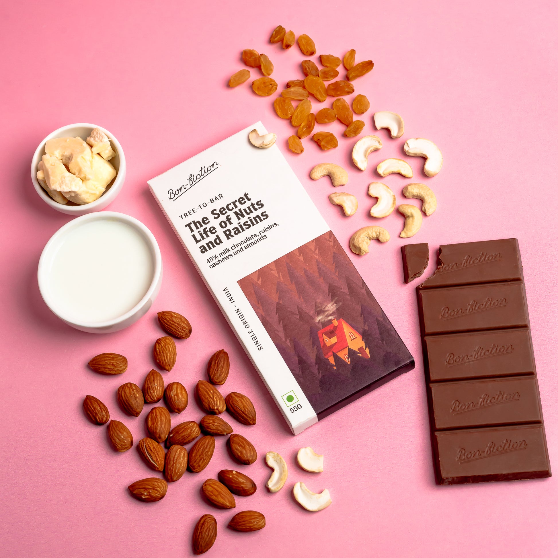 Natural Cacao Beans, Pure Cocoa Butter, Roasted Almonds, Cashews, Raisins, Skimmed Milk, Organic Cane Sugar, Sunflower Lecithin