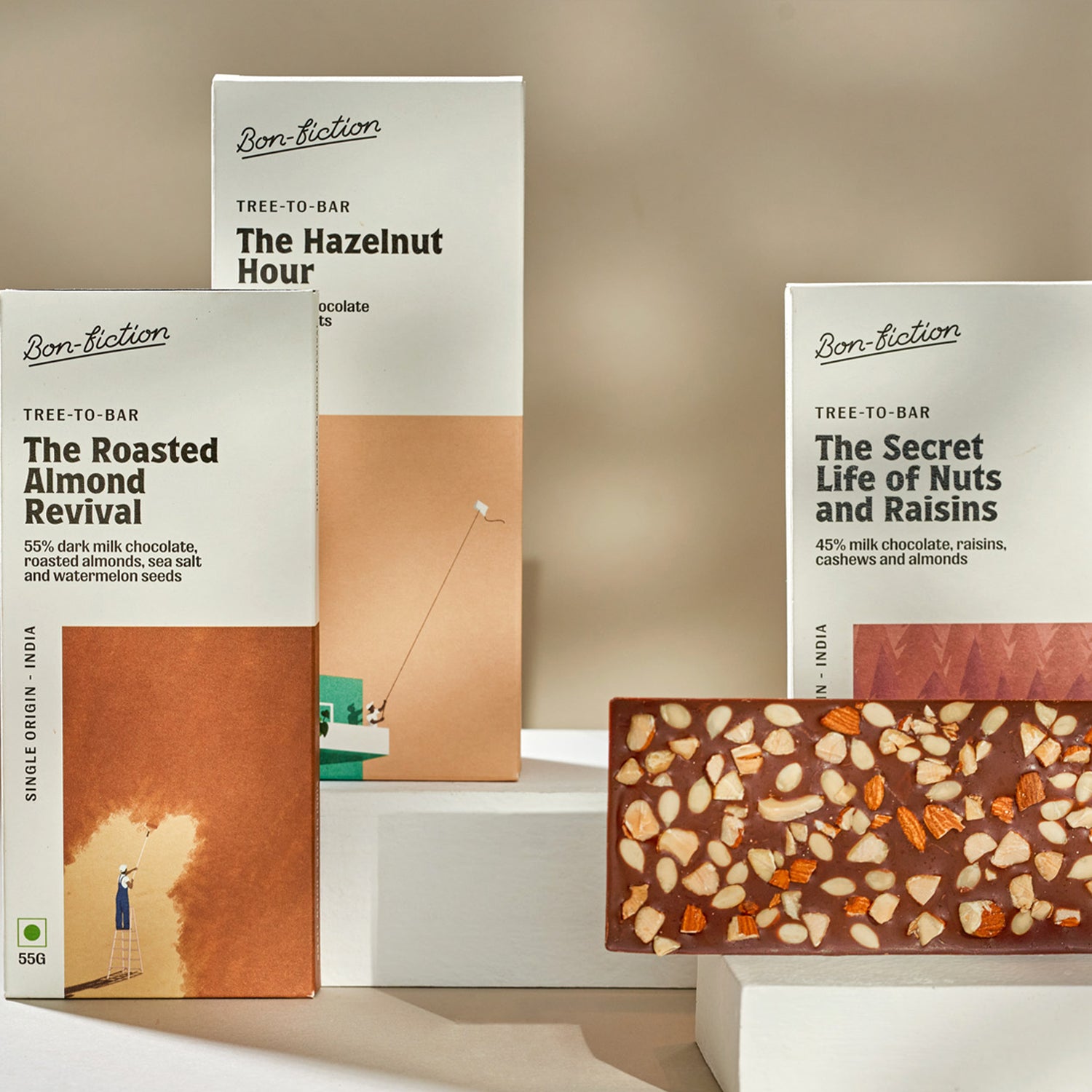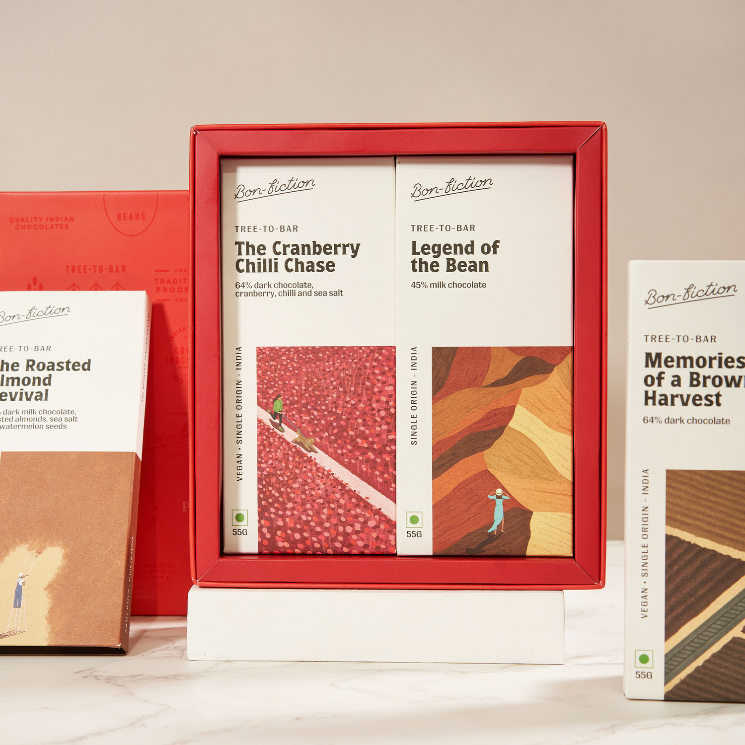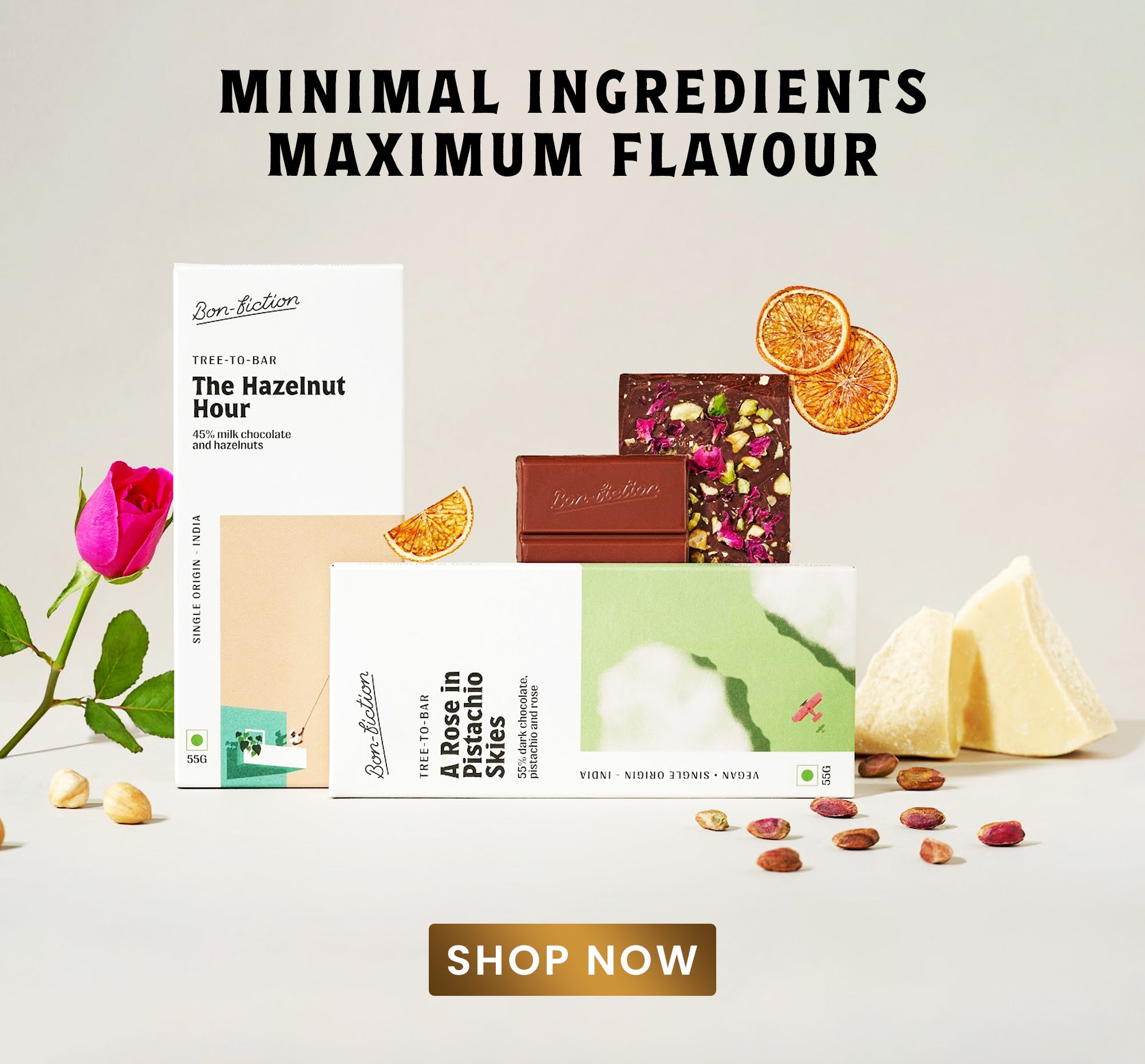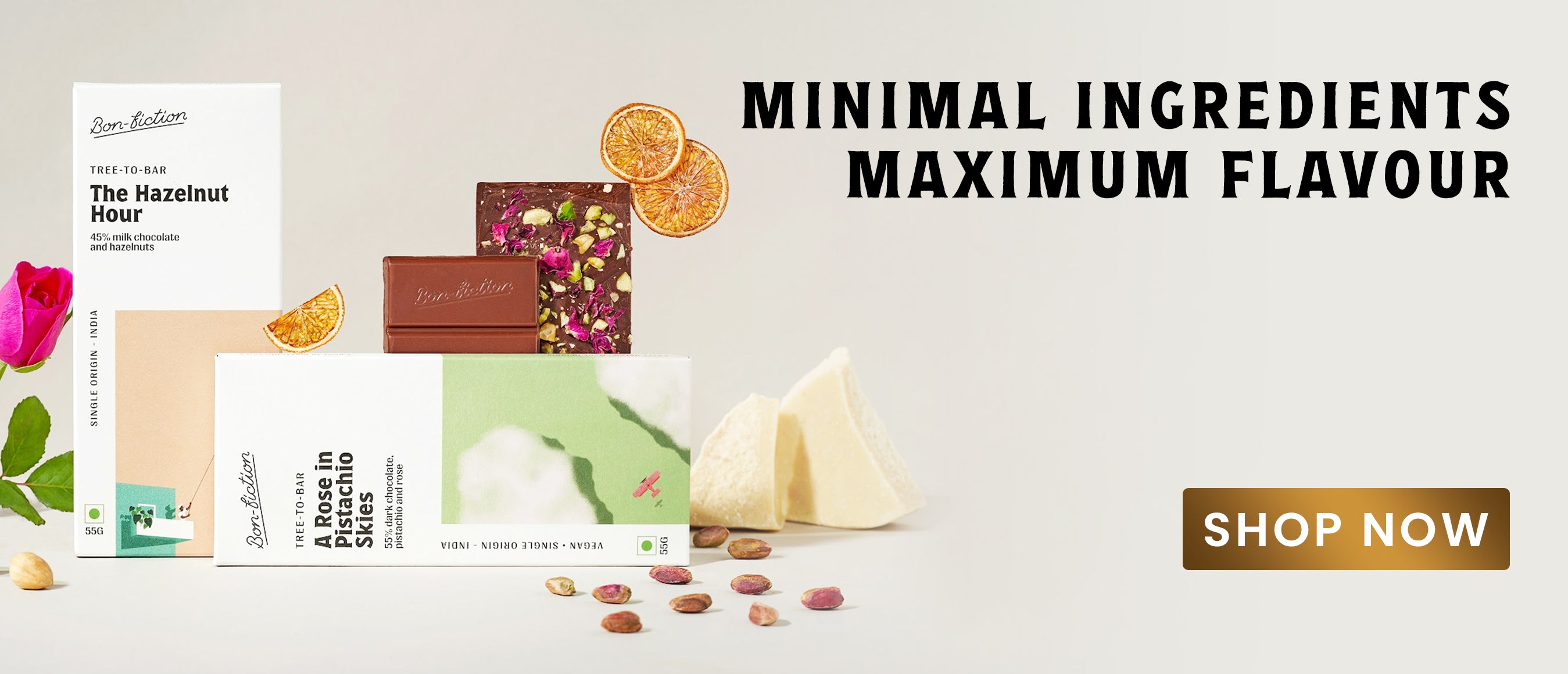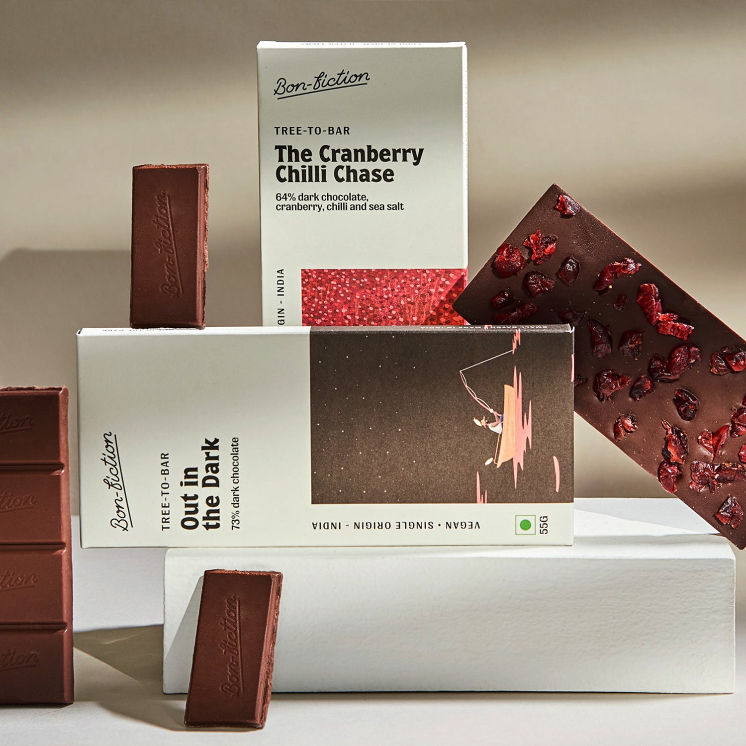 At Bon-Fiction, we take pride in executing every stage of chocolate making in a unique, sustainable manner while compromising on really, ‘nothing’. We entail all ingredients ‘natural’ and entertain no chemically processed intermediaries making the bar the most natural chocolate bar. Our journey with chocolate begins right on the field, the farmer, the seed and continues till the chocolate bar is artisan-made with quality. Therefore, we believe Bon-Fiction is not merely dark chocolate bars but the brilliance of finesse layers compressed within them.