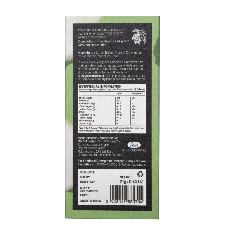 Natural Cacao Beans, Pure Cocoa Butter, Rose Petals, Pistachios, Organic Cane Sugar
