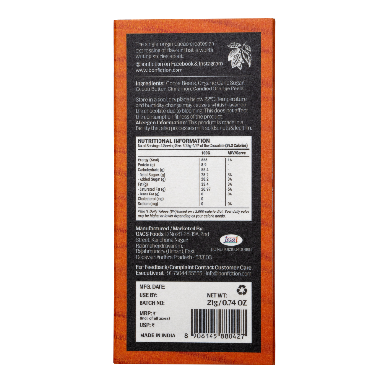 In the mood for a taste ride? This roller coaster of a chocolate bar fancying the flavors of cinnamon and orange is yet another one to not miss out on. This 64% Chocolate is infused with cinnamon and topped with bits of our candied orange peel. The candied peel gives a burst of orange flavour with every bite into the bar.
